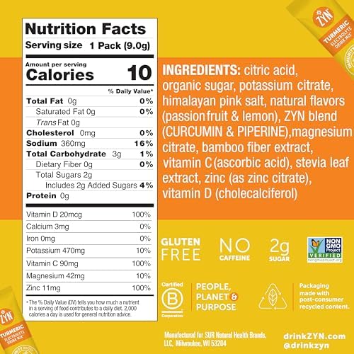 - HELPS SUPPORT YOUR IMMUNE SYSTEM: Get your daily dose of vitamin C, D, and zinc from ZYN’s Turmeric drink mixes. Fortified with 100% daily value of these much-needed vitamins and minerals, it’s an effective powerhouse to help boost your immune defense, while providing the perfect balance of electrolyte minerals for rapid hydration.